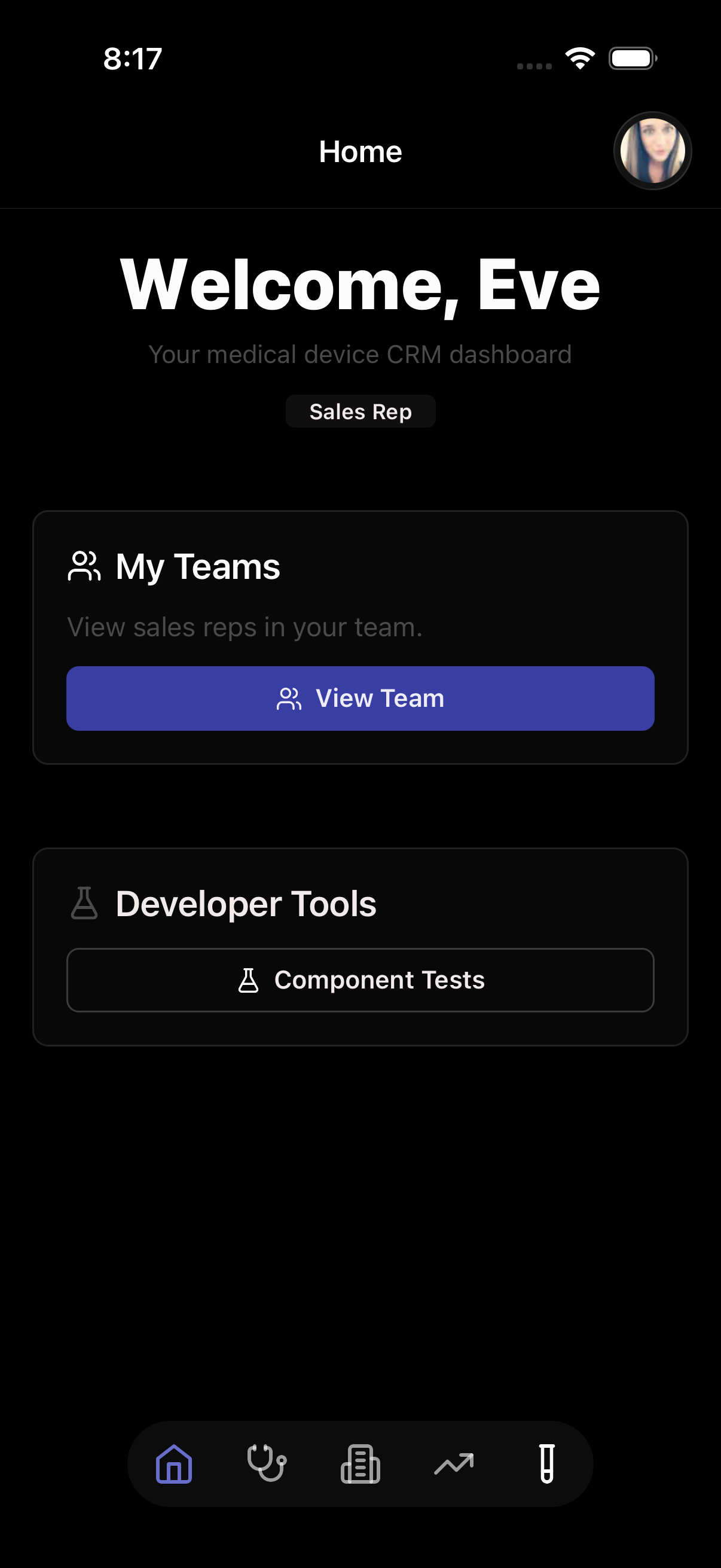 The primary tool for field reps. Full CRM functionality optimized for on-the-go use between cases and hospital visits.