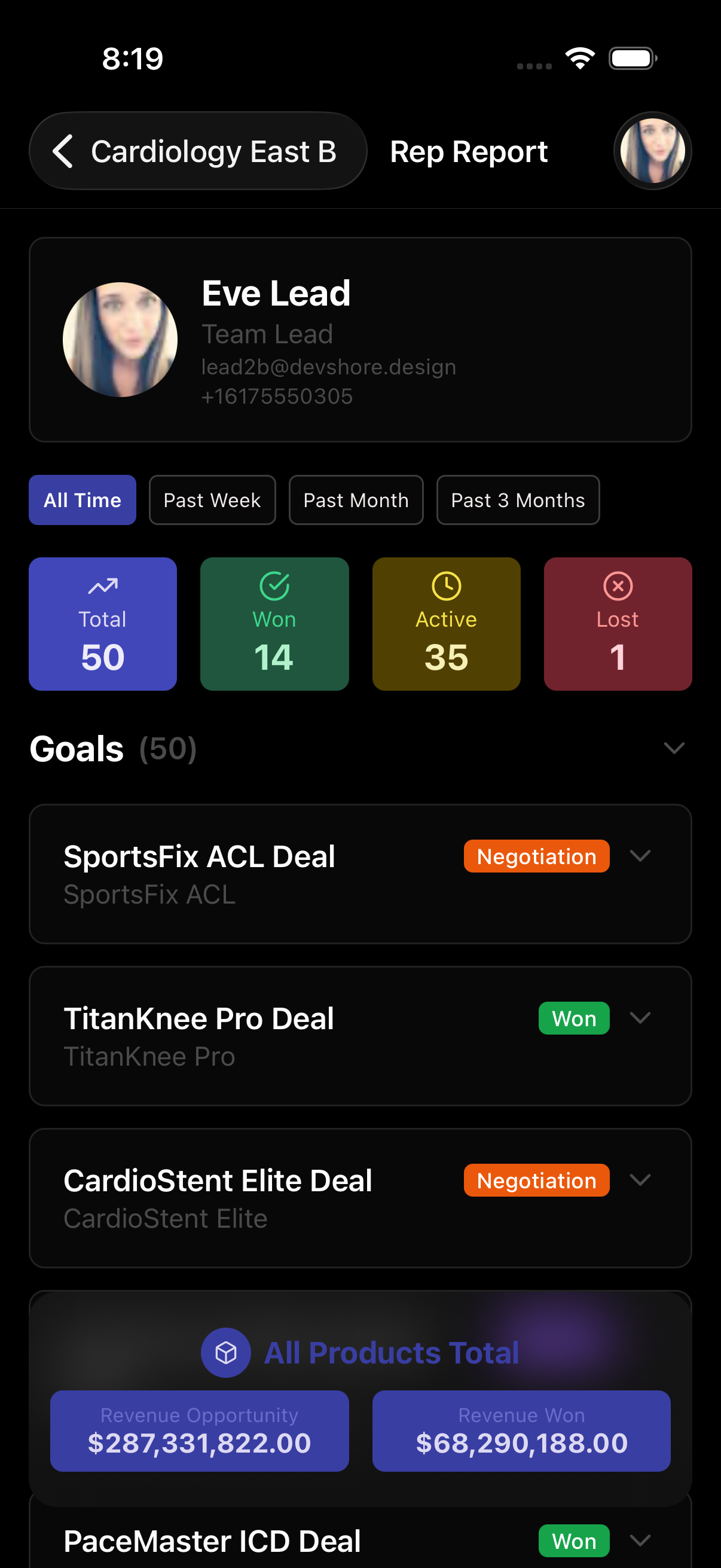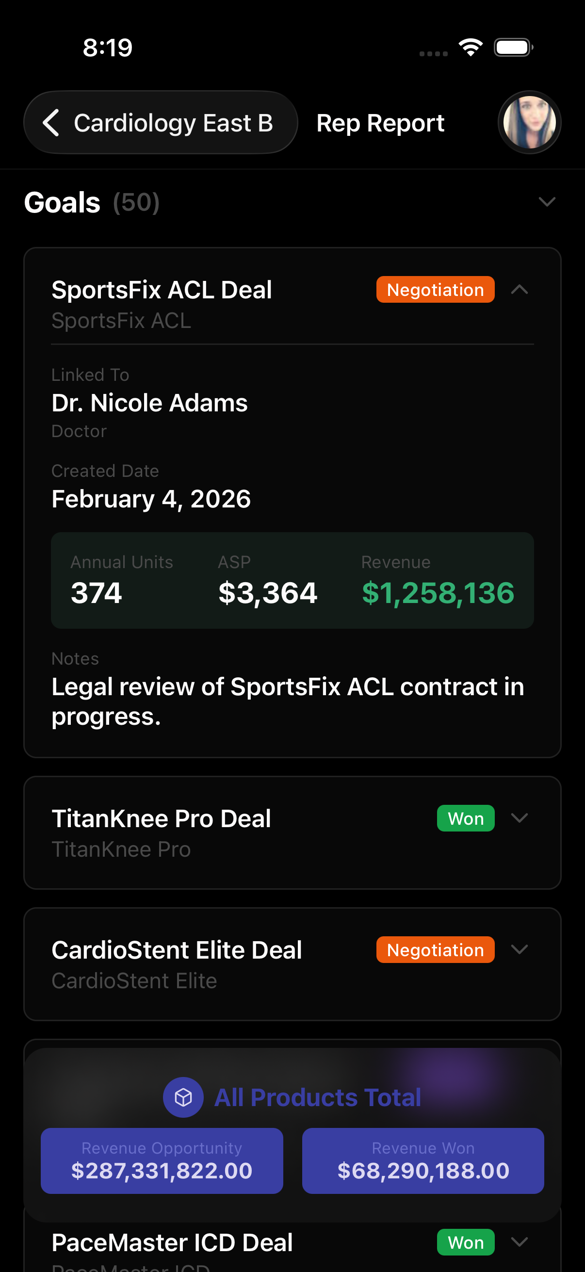 Track every opportunity from first contact to closed deal. Goals are linked directly to the surgeon or facility involved, with product association and revenue tracking built in.