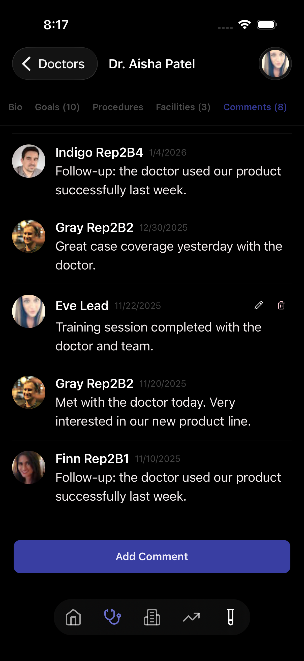 Build rich profiles for every doctor you work with. Track their medical background, specialties, facility affiliations, and personal details that strengthen relationships.